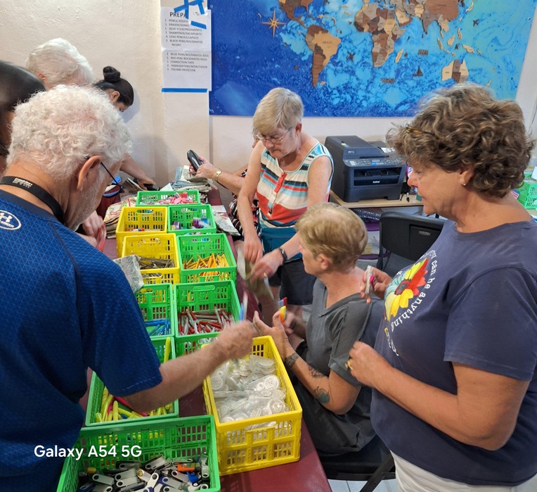 We were thrilled at this idea and Sharyn’s generosity so we gladly accepted and immediately made a wish list that donors could purchase from and ship the supplies directly to her. Sharyn arrived in Cozumel on May 12 with 100 pounds of school supplies which included 86 Backpacks, 60 boxes of colored pencils, 390 pens and 250 pencil pouches. The pencil pouches are hand-made by the women from Volunteer Christian Builders (They have provided us with pencil pouches every year for 8+ years for a total of over 4,000 pencil pouches a well as other market bags, gift bags, and other items). Sharyn also brought us cash donations which will be used to purchase a number of supplies from local merchants here in Cozumel.